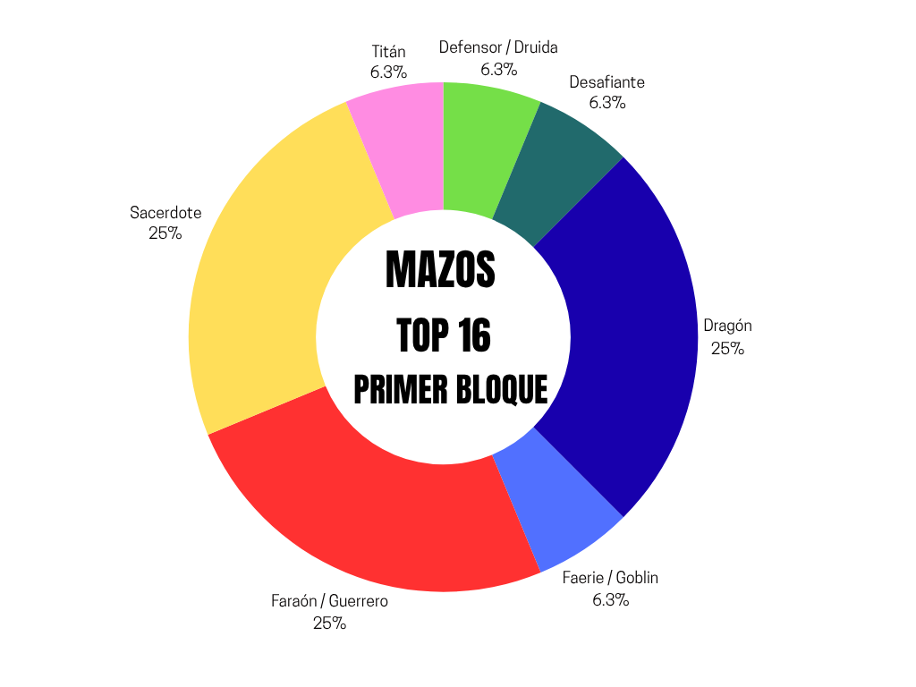 Dentro del top 16 el torneo se encontró con cierta encrucijada, donde las razas que aún estaban en competencia se encontraron en una constante los tres mazos más potentes de este aniversario con 25 % y el resto de conjuntos con 6,3 %