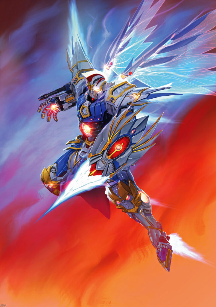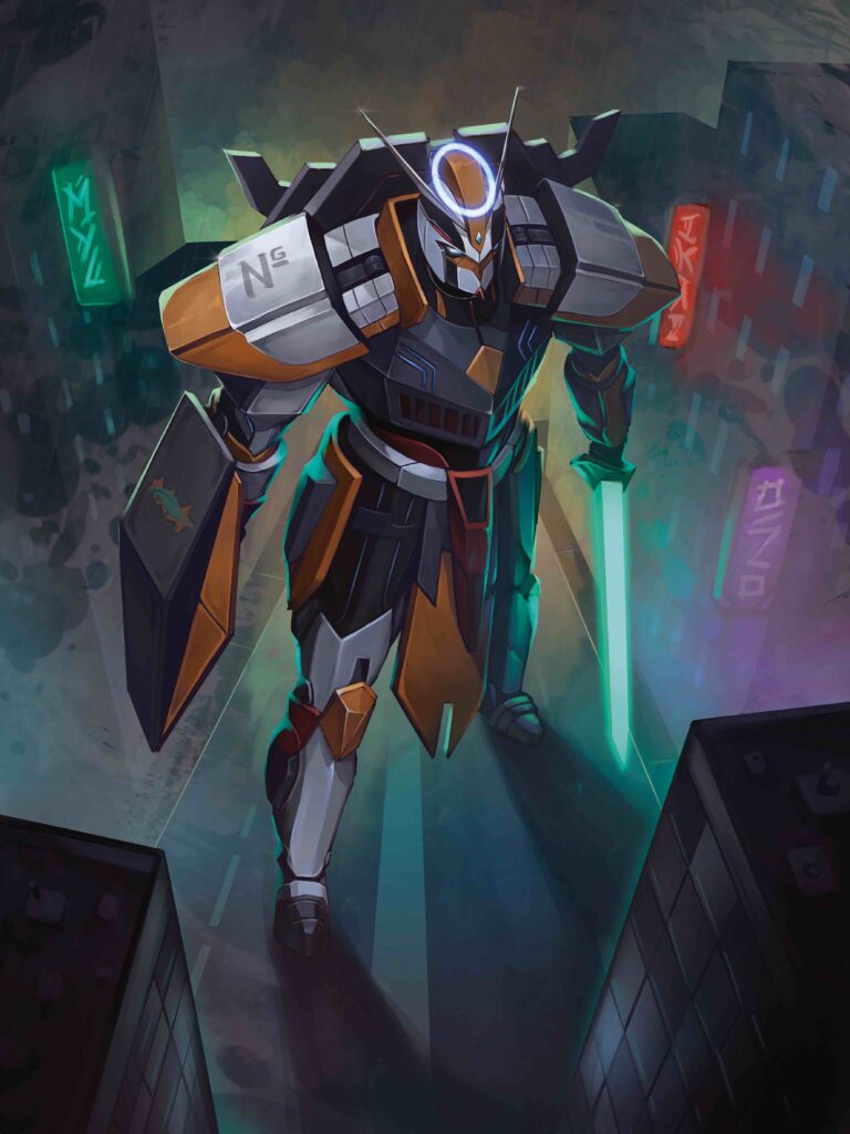 No le devolvieron la vieja armadura, ese cascarón heroico, pesado y orgulloso, la despidieron con un rito y, en su lugar, tejieron un exoesqueleto lígneo-lumínico: láminas vivas de metal cantor unidas por nervaduras de energía que respiran con el piloto.