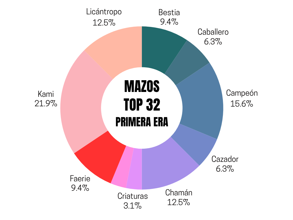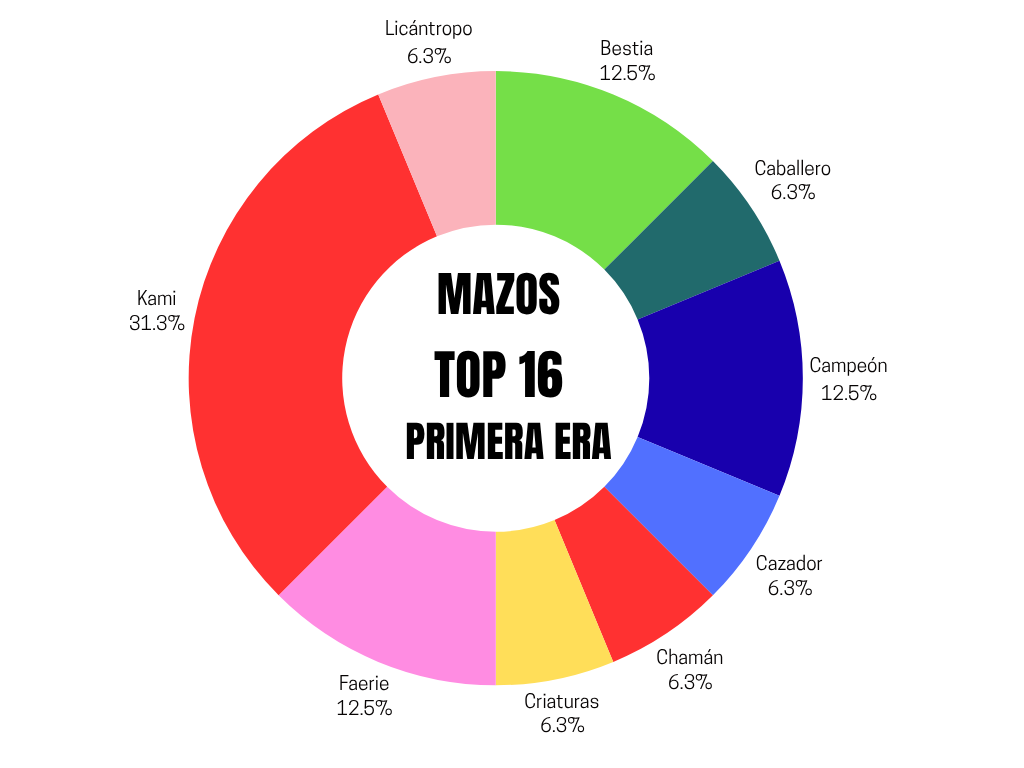 Ya para el top 16 las cosas cambiaron mucho, excepto Kami como el mazo preferido de la jornada, pero lo inesperado estaba con el triple empate del 12.5 % de las razas Campeón, Faerie y Bestia que estás dos últimas agarraron un vuelo sorpresivo.