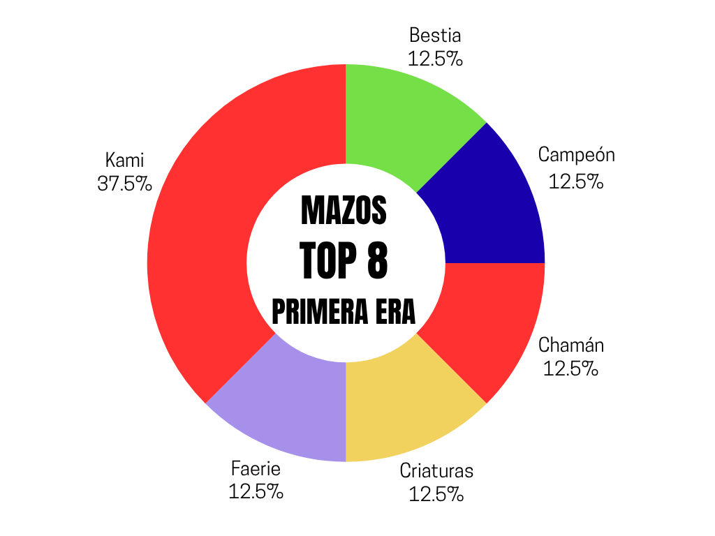 Ya para los top 8 la cosa se discutía en solo seis razas Bestia, Campeón, Kami, Chamán, Criaturas y Faerie. Aunque fue el conjunto de Kami que todavía marcaba toda la tendencia