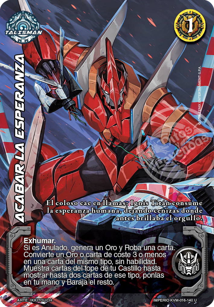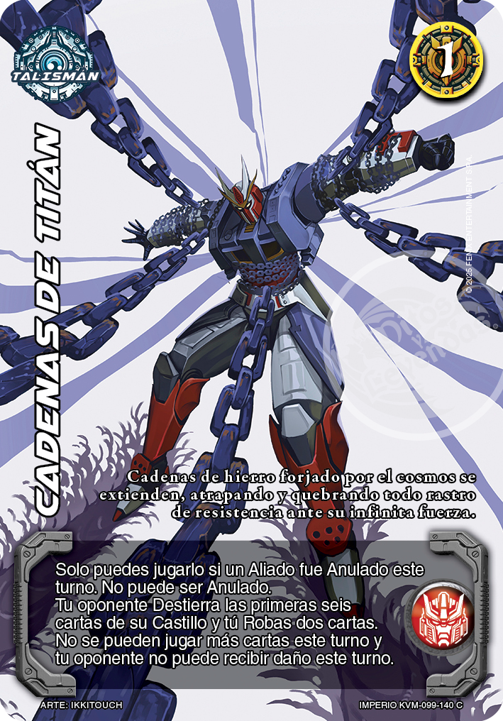 Cadenas de Titán: Es una carta muy potente aunque un poco situacional, desterrarle 6 cartas al castillo oponente sin poder ser Anulado es de una potencia enorme por un solo Oro además de robar dos cartas. Claro que debes usarlo como la última carta del turno al igual que Trempilcahue, pero castigarás de forma implacable que tu oponente haya controlado tus jugadas del turno.