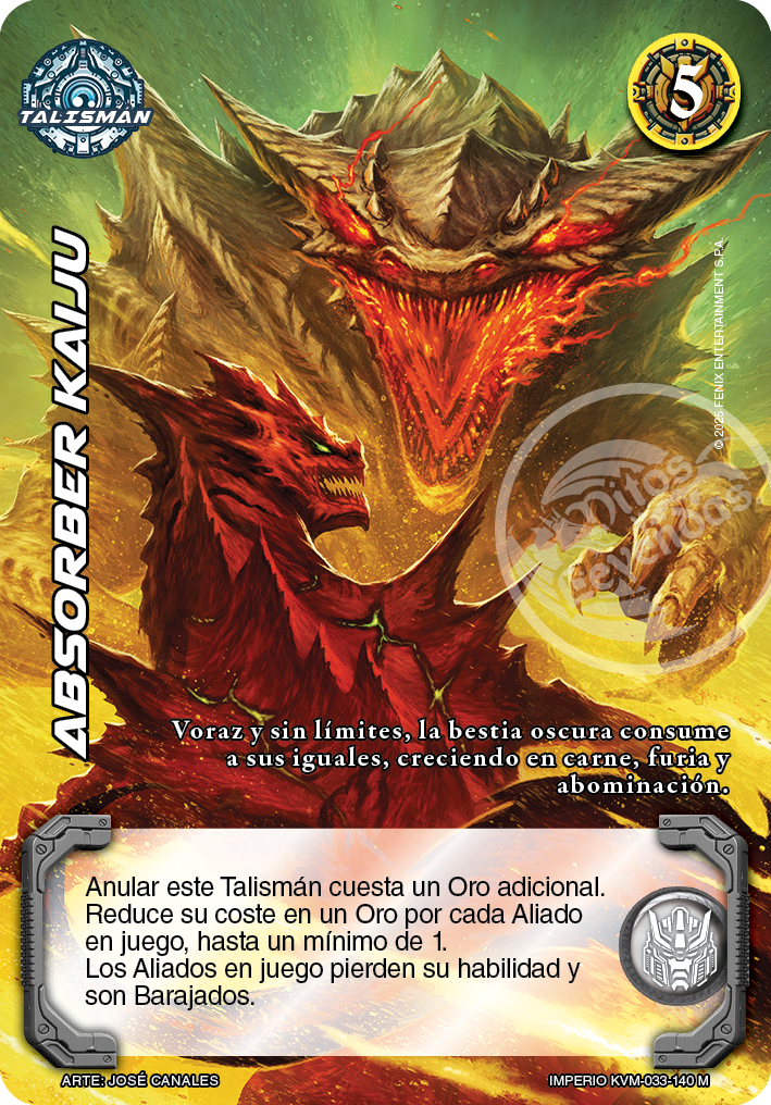 Absorver Kaiju: Un removal masivo según plaga del oponente similar a lo que algún día fue Carpa Dragón pero adaptado a las nuevas tendencias. Como los mazos agresivos en general se preparan para anular Talismanes, tiene ahí una pequeña protección. También les hace perder la habilidad a los Aliados así que no disparan habilidades de salida. Lo malo es que bajara también los tuyos, pero contra mazos agresivos puede ser un side deck espectacular, sobre todo con otras formas de frenar daño para barrer la mesa en tu turno por un oro menos que lo haría Kasha.