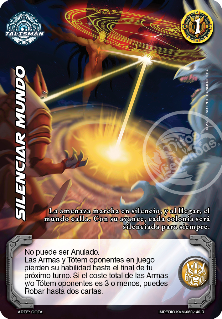 Silenciar Mundo: Las Armas y Tótem están muy fuertes actualmente, con cartas como Templo de Hatshepsut, Ciudad de los Césares, Carcosa, Espada de Ohiggins, Estaca, el nuevo Cañon de Helios que reemplazará a Mjolnir, entre otros. La posibilidad de contrarrestarlos por dos turnos tuyos sin poder ser anulado es espectacular, más si consideramos que te da dos cartas más en mano para seguir presionando y haciendo tu juego.