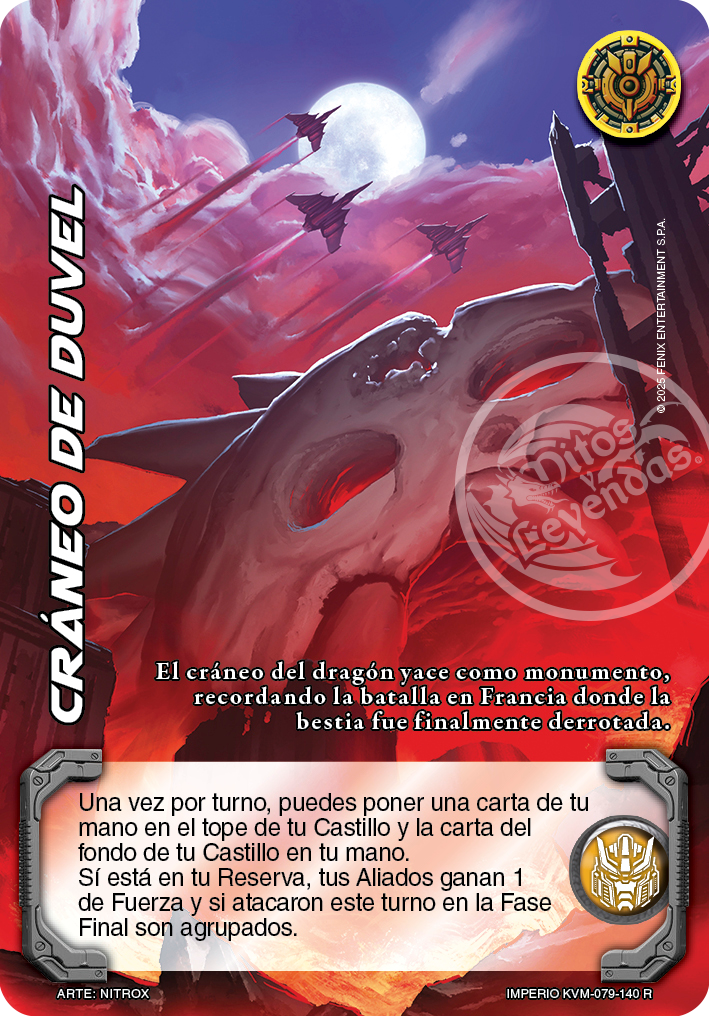 Cráneo de Duvel: Un oro que me recuerda a Guitarra Andaluza para poner en el tope cartas, sin embargo Cráneo ofrece algo más en combinación con cartas como Tyet y Cuervo Nocturno. Ideal para poner Hook en el tope y mostrarlo con Chiyome o Elemental de Magma, o poner una carta en el tope para jugarla con Perder la Razón, ponerla como aliado sin habilidad con Biblioteca de Caballería, etc.
