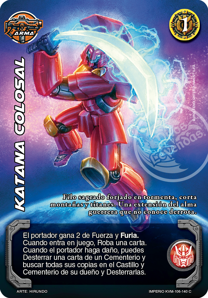 Katana Colosal: Una herramienta de control de cementerio y desarme de estrategias ideal para un mazo agresivo, le da Furia al portador haciendo más fácil conectar daño para desterrar cementerio, robas una carta y luego desarmas la estrategia de tu oponente quitando completamente de la partida las copias de las cartas que más te molesten.