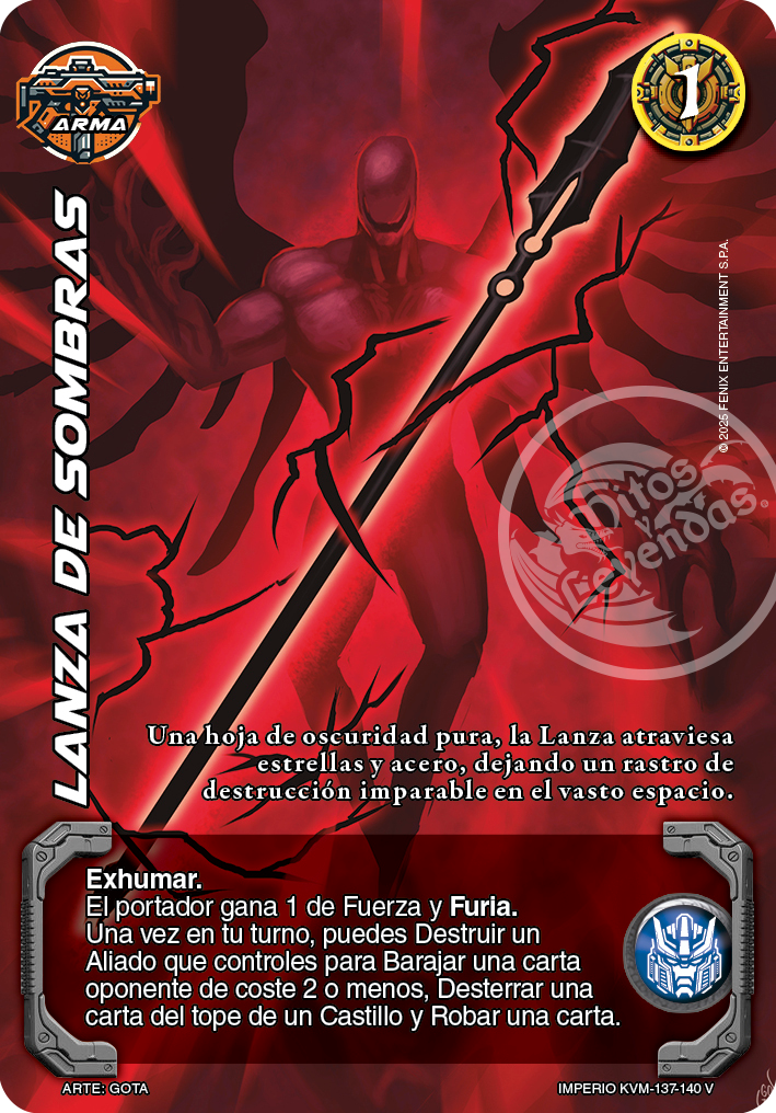 Lanza de Sombras: Una de las mejores armas de todos los tiempos vuelve en forma de Vasallo accesible para todos los jugadores, la añorada Estaca y Martillo de Despertar Gótico permite ir haciendo muchos removal por sólo 1 Oro y un Aliado de tu mesa, al mismo tiempo que roba y le destierra cartas del mazo al oponente. Sin duda una excelente adición a mazos plaga como el Bestia, Sombra, Guerrero o Dragón que además tienen buena sinergia destruyendo sus Aliados.