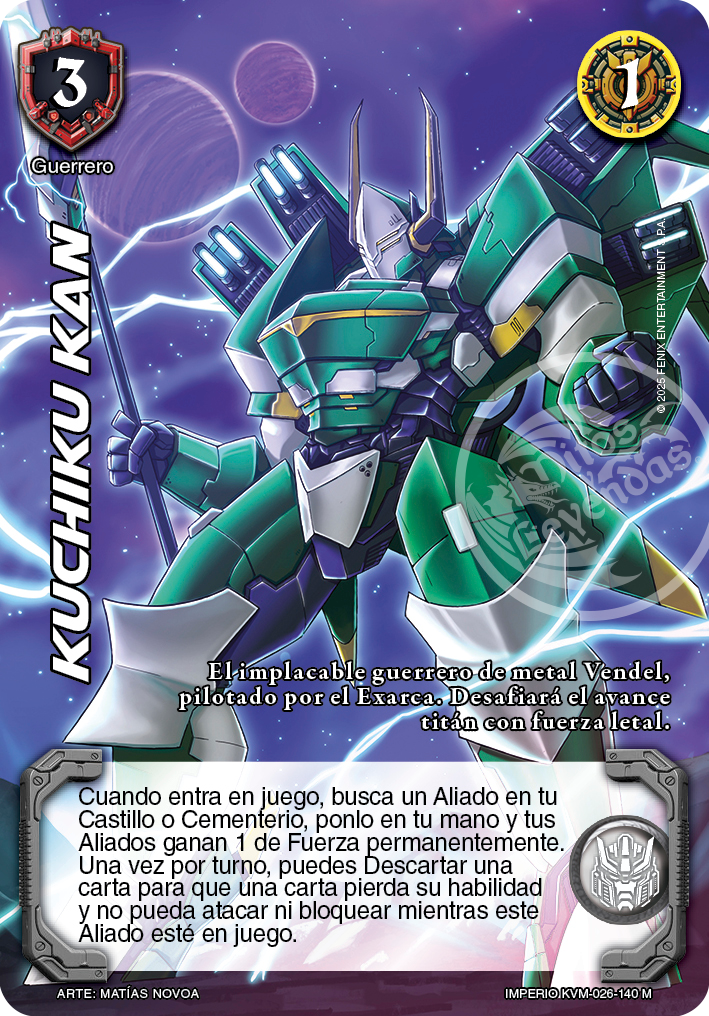 En esta edición los Guerreros están comandados por el mecha más destructor y poderoso de los Vendels, Kushiku, un Aliado muy versátil, con un impacto en mesa brutal, un Guerrero Fuerza 4 y Coste 2 que cumple dos funciones, hacer mesa reclutando cualquier Aliado del Castillo o del Cementerio, lo que te permite recuperar Aliados que se hayan caído por daño o buscar el Aliado que necesitas para poder ganar la mesa, ejercer más presión o finiquitar la partida. Además tiene una segunda habilidad que te permite sacar cartas del campo y hacer daño directo según la fuerza de este Aliado, una habilidad muy poderosa que permite sacarte a los bloqueadores de tu oponente o cartas molestas al mismo tiempo que te presiona por daño.