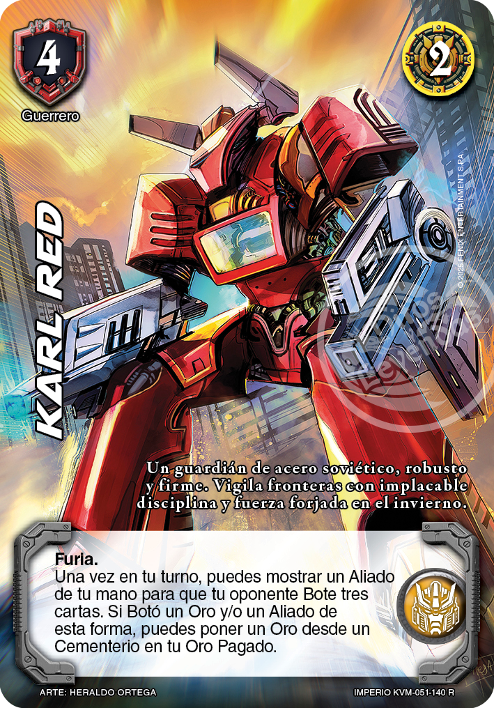 En primer lugar, un Aliado dentro de la mecánica del saqueo y haciendo daño directo Karl Red te permite disparar habilidades de los Aliados que son mostrados, hace 3 de daño y además te permite poner un Oro desde cualquier cementerio en tu Oro pagado. Sin lugar a duda una carta que deberías probar en tu construcción de la baraja.