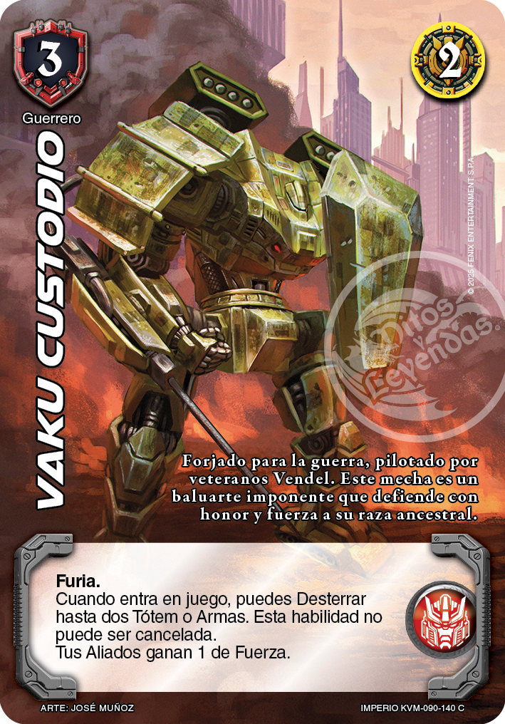 Vaku Custodio un mecha que viene a ser una carta para usar de banquillo contra mazos que centran su estrategia en los tótem y las armas, además con una pasiva que parece inofensiva, pero que tus Aliados ganan uno de fuerza es a veces suficiente para ganar los combates.
