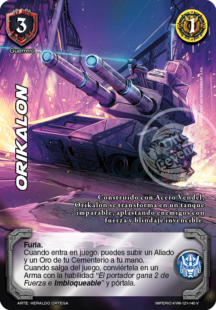 Y finalmente Orikalon, una joyita oculta, un muy buen Aliado para recuperar recursos y proponer juego en la mitad de la partida, cuando los recursos empiezan a ser escasos. Un Aliado que tiene una habilidad de salida muy entretenida que puede portar con un Arma que da 2 de fuerza e Imbloquable al portador. Una carta muy versátil y entretenida.