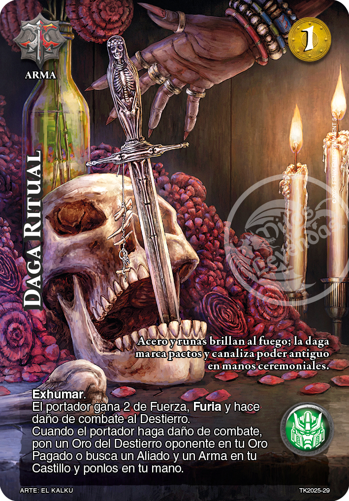 El tipo de carta que ayuda a los mazos aggro son, sin duda, las armas. A mí en general me gusta jugar razas humanas, y tanto Caballeros como Guerreros deberían estar más que contentos con Daga Ritual. Un cartonazo. Le da Furia a tu Aliado, además de hacer daño letal (directo al destierro), y te permite recuperar la curva jugando Oros del Destierro oponente. Esta carta es brutalmente buena. Sin lugar a dudas, le pelea el espacio a cualquier arma del formato actual. Necesitas que resuelva todo su efecto solo una vez para obtener una ventaja gigantesca. Además, si no tiene Oros en el Destierro, puede servir igualmente como un excelente motor, buscando dos cartas.