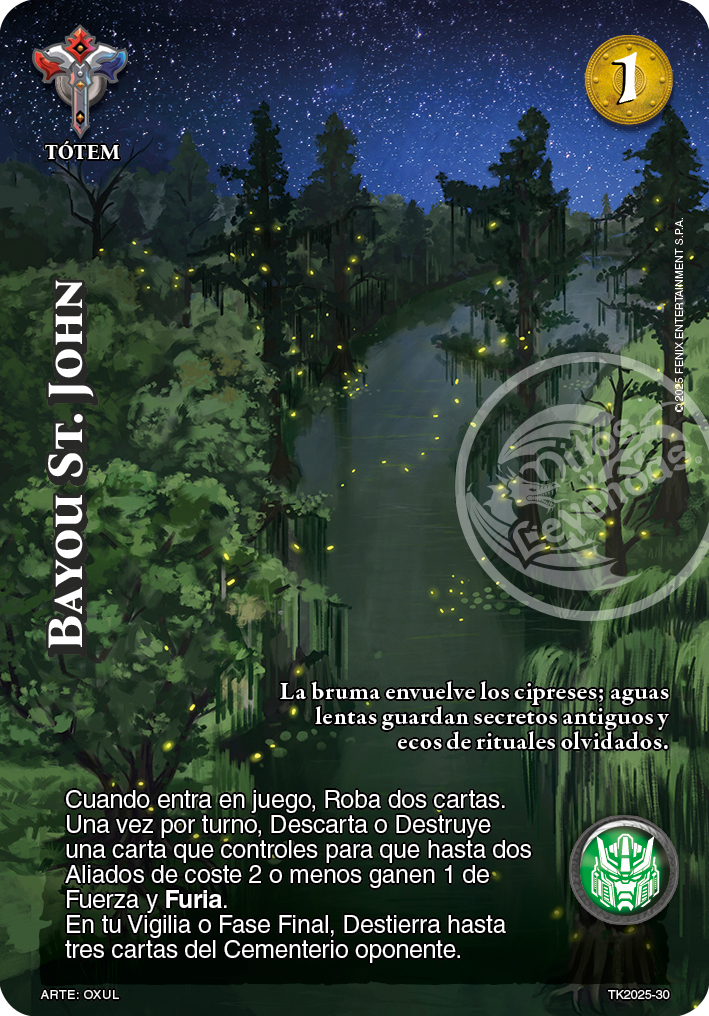 Uno de los problemas que tiene el mazo Bestia es que no posee una forma consistente de darle Furia a sus Aliados. Para ese problema llegó Bayou St. John, un tótem que tiene una infinidad de combos con Alto Prime, La Fuerza, entre otros Aliados, y que puede hacer que la cantidad de daño que genere el mazo sea muy grande dándole Furia a Aliados como Mocha Dick, Quimera Voragh, Kuchiku Kan, Héroes y Caballeros en general, algunos Dragones, etc. El control de cementerio es la guinda de la torta.